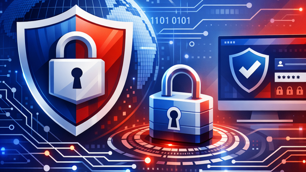 La « Cybersécurité » Voici le logo moderne qui évoque la cybersécurité numérique, la technologie blockchain et l’innovation, en utilisant les couleurs bleu,rouge et blanc, avec un symbole de bouclier stylisé, des éléments de cadenas et une typographie futuriste pour le texte DeFiMax.top.